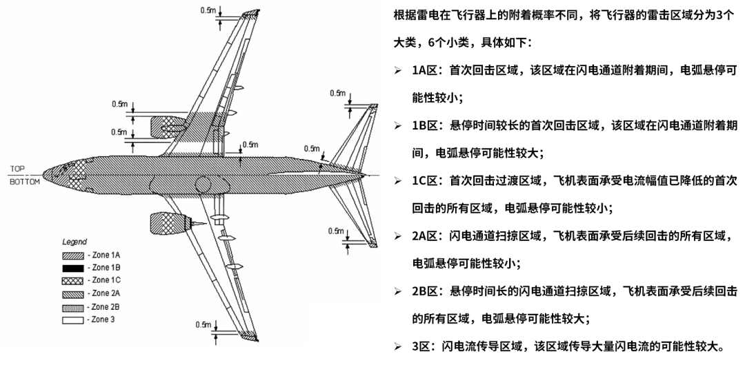 根據雷電在飛行器上的附著概率不同,將飛行器的雷擊區域分為