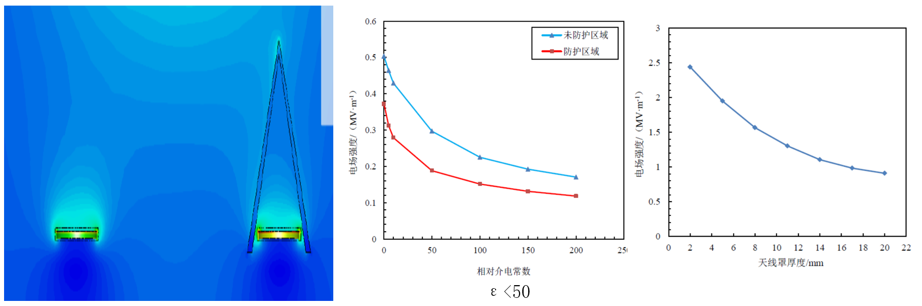 對于傳統介質:隨罩體 εr 增加 ,天線罩相對介電常數在 0~50 以內變化時防雷效果較明顯。