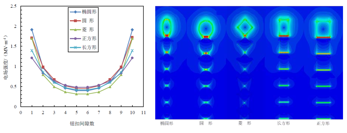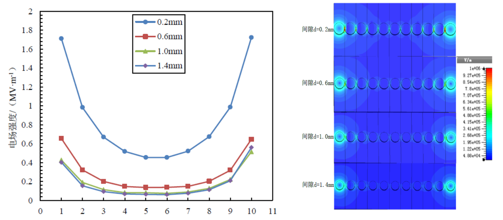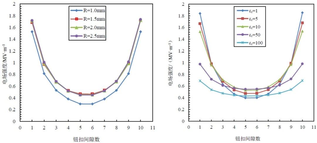 隨罩體厚度增加, 內部天線附近電場逐漸降低,且趨勢越來越緩。