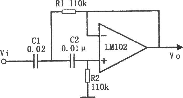如上圖所示為有源高通濾波電路。該電路的截止頻率fc=100Hz。電路中,R1與R2之比和C1與C2之比可以是各種值。該電路采用R1=R2和C1=2C2。采用C1=C2和R1=2R2也可以。