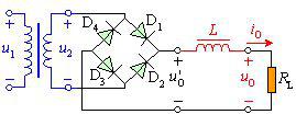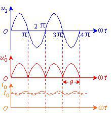 在橋式整流電路中,當u2正半周時,D1、D3導電,電感中的電流將滯后u2不到90°。當u2超過90°后開始下降,電感上的反電勢有助于D1、D3繼續導電。當u2處于負半周時,D2、D4導電,變壓器副邊電壓全部加到D1、D3兩端,致使D1、D3反偏而截止,此時,電感中的電流將經由D2、D4提供。由于橋式電路的對稱性和電感中電流的連續性,四個二極管D1、D3;D2、D4的導電角θ都是180°,這一點與電容濾波電路不同。