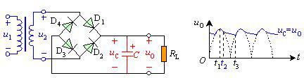 式中 包括變壓器副邊繞組的直流電阻和二極管的正向導通電阻。由于 一般很小,電容器很快就充到交流電壓u2的最大值 ,如波形圖2(b) 的時刻。此后,u2開始下降,由于電路輸出端沒接負載,電容器沒有放電回路,所以電容電壓值uC不變,此時,uC>u2,二極管兩端承受反向電壓,處于截止狀態,電路的輸出電壓 ,電路輸出維持一個恒定值。實際上電路總要帶一定的負載,有負載的情況如下。