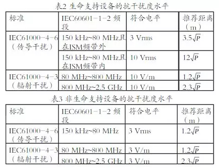 在IEC 60601-1-2《醫用電氣設備第1-2部分:安全通用要求并列標準:電磁兼容要求和試驗》中,規定了對生命支持設備和非生命支持設備的電磁抗擾度,他們的抗干擾水平分別為10 V/m和 3V/m[9] 。生命支持設備主要指呼吸機、血透機等對維持患者生命起著關鍵作用的醫療設備,相較于非生命支持設備,這類設備的安全性能要求更為嚴格,抗電磁干擾水平也高于非生命支持設備。在IEC61000-4-3《電磁兼容性(EMC)第4-3部分:測試及測量技術?放射性、射頻式、電磁場抗干擾度試驗》針對所有電子電氣設備的電磁兼容標準中,醫療設備屬于其中的水平等級3和水平等級2[10-11]。低頻率的干擾主要來源于傳導發射產生的干擾電壓;而高頻率的干擾主要來源于輻射發射產生的電磁干擾場強。同時在IEC60601-1-2標準中,也給出了在電磁環境中醫療設備抗干擾度的推薦距離,在相同的發射功率下,生命支持設備的抗電磁干擾水平要高于非生命支持設備,推薦距離也相對較遠,如表2~3所示。