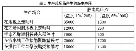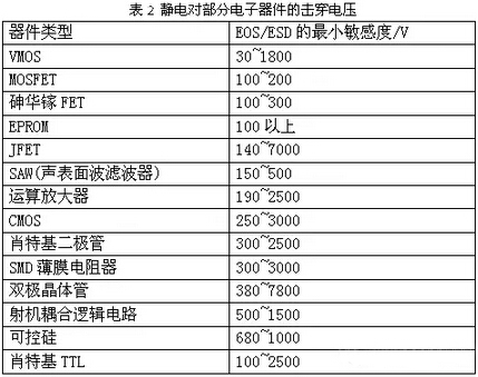 要密切注意元件在不易察覺的放電電壓下發生的損壞,這一點非常重要。人體有感覺的靜電放電電壓為3000v~5000v,然而,元件發生損壞時的電壓僅幾百伏,。這勢必會對電子電路的性能產生影響。表1和表2分別列出了典型生產現場易產生的靜電電壓及靜電對部分電子器件的擊穿電壓。由這兩個表我們可以看出,相對于自然界的靜電來說,電子器件是非常嬌貴的,正是基于這一因素,是否采取了靜電防護措施是衡量電子器件質量好壞的一個非常重要的指標。