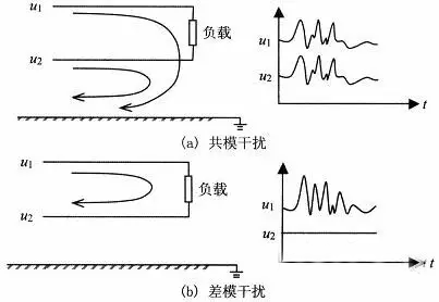 差模干擾(Differential-mode):兩導線上的干擾電流,振幅相等,方向相反稱為差模干擾。