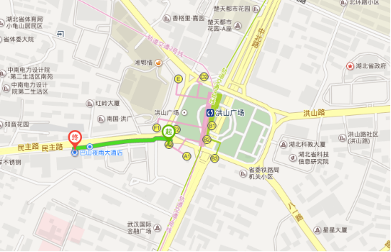 【交通路線】:乘坐軌道交通2號線/4號線到達洪山廣場站A2出口,向前步行300米到達終點。