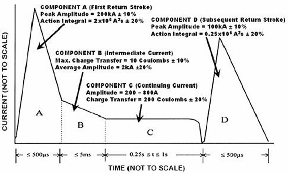 電流峰值100 kA ± 10%,單向或震蕩電流,上升(峰值前10% - 90%)時(shí)間不大于25μs,電流衰減到波峰的1%時(shí)間不超過500 μs,作用積分為0.25×106A2S ± 20%(在500 μs內(nèi))。 |