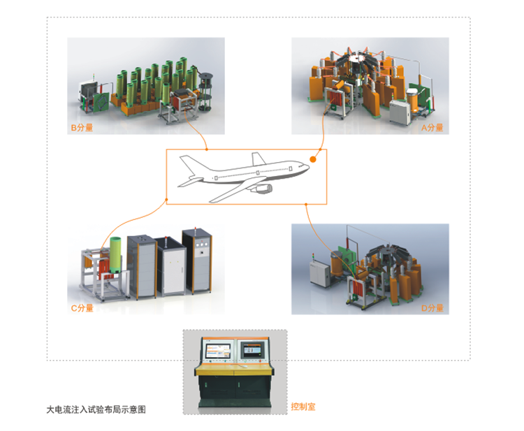 飛機(jī)在強(qiáng)對(duì)流天氣飛行時(shí),容易受到雷電的直接附著作用,產(chǎn)生高溫、高壓和強(qiáng)電磁力,對(duì)飛機(jī)造成燃燒、溶蝕、爆炸、結(jié)構(gòu)畸變和強(qiáng)度降低等效應(yīng)。我司自主研發(fā)的飛機(jī)整機(jī)防雷測(cè)試系統(tǒng)是一套非常復(fù)雜的脈沖電流測(cè)試系統(tǒng),完全符合美軍標(biāo)MIL-STD-464C、SAE ARP5412、DO160 section23等飛機(jī)防雷標(biāo)準(zhǔn)要求,模擬飛機(jī)的直接附著雷擊區(qū)域應(yīng)承受由ABCD四個(gè)波形組成的連續(xù)波形進(jìn)行直接效應(yīng)雷擊,整套系統(tǒng)包含4套脈沖電流發(fā)生器。 |